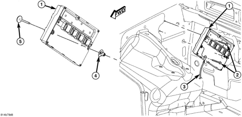 3. A locating pin (5) is used in place of one of the PCM mounting bolts. Pry clip (4) from pin (5).