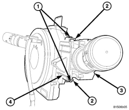 3. Remove the two screws (1) that secure the right multi-function switch (3) to the locating tabs (2) on the right side of the Steering Control Module (SCM) (4).