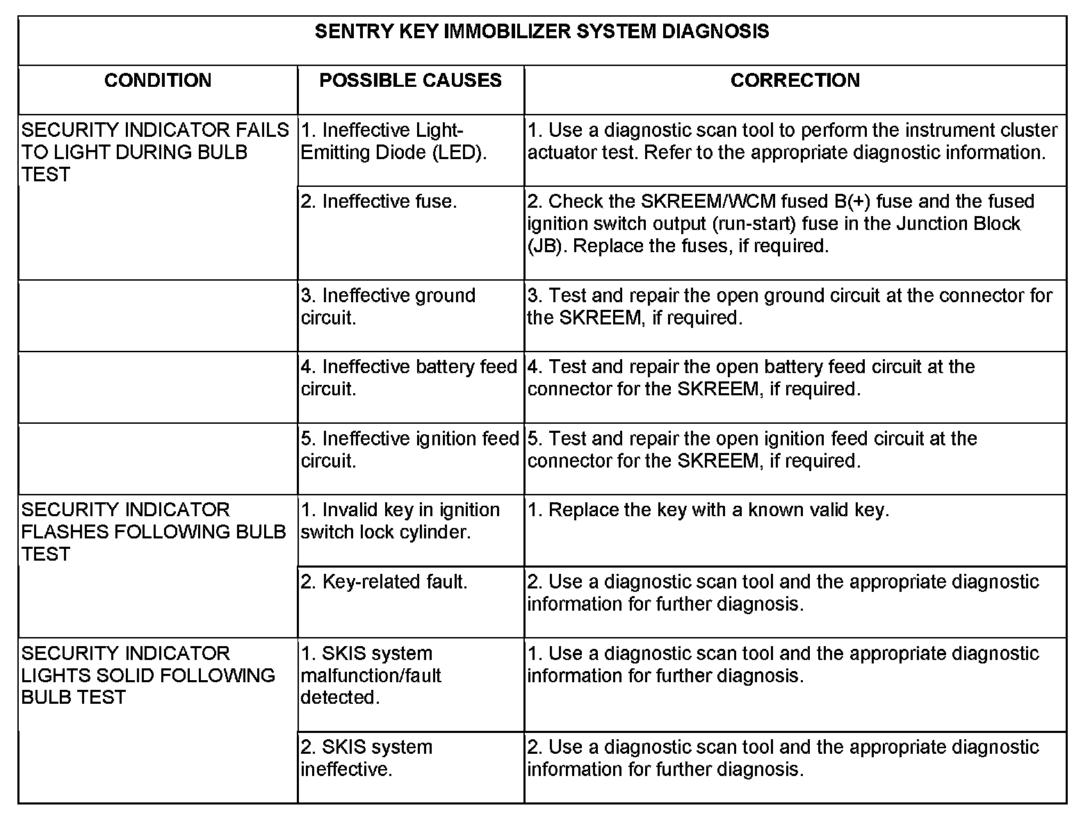 However, conventional diagnostic methods will not prove conclusive in the diagnosis of the SKIS or the electronic controls or communication between other modules and devices that provide some features of the SKIS. The most reliable, efficient, and accurate means to diagnose the SKIS or the electronic controls and communication related to SKIS operation requires the use of a diagnostic scan tool. Refer to the appropriate diagnostic information.
