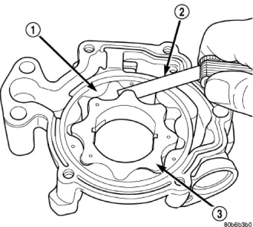 4. Install the inner rotor in the into the oil pump body. Measure the clearance between the inner (3) and outer rotors (1). If the clearance between the rotors is .150 mm (0.006 in.) or more the oil pump assembly must be replaced.