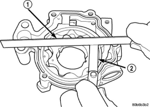 5. Place a straight edge (1) across the body of the oil pump (between the bolt holes), if a feeler gauge (2) of .095 mm (0.0038 in.) or greater can be inserted between the straightedge and the rotors, the pump must be replaced.