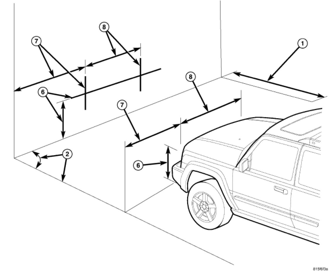 2. An adjacent wall or floor member that is perpendicular to the alignment screen can be used as the vertical zero reference. If there is no adjacent wall or floor member that is perpendicular to the screen, tape a second line on the floor perpendicular to both the alignment screen and the first line, and outboard of either side of where the vehicle will be positioned. This will be used as the vertical zero reference.