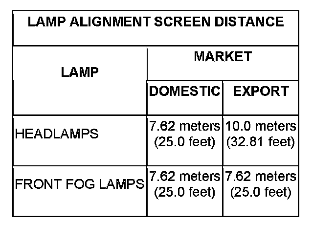 NOTE: Due to the linear nature of the headlamp cutoff, a properly aimed low beam headlamp will project the top edge of the high intensity pattern on the alignment screen from the horizontal line to 50 millimeters (2 inches) below the horizontal line for domestic market vehicles, or to 125 millimeters (5 inches) below the horizontal line for export market vehicles. No horizontal (right/left) adjustment is required for this headlamp beam pattern in domestic market vehicles. Export market vehicles have a second horizontal (right/left) adjustment screw provided, which is accessible through a clearance hole on the inboard side of the front lamp unit cover. The high beam pattern will be correct when the low beams are properly aimed.