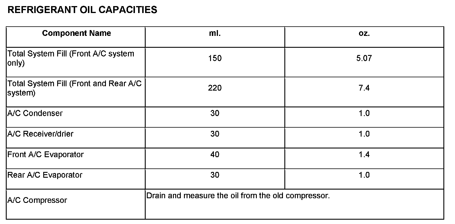 When an A/C system is assembled at the factory, all components except the A/C compressor are refrigerant oil free. After the refrigerant system has been charged and operated, the refrigerant oil in the A/C compressor is dispersed throughout the refrigerant system. The receiver/drier, A/C evaporator, A/C condenser and the A/C compressor will each retain a significant amount of the needed refrigerant oil.