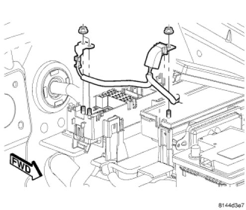 20. Install both battery positive cable eyelet terminals onto the B(+) terminal studs in the Power Distribution Center (PDC) and Integrated Power Module (IPM).