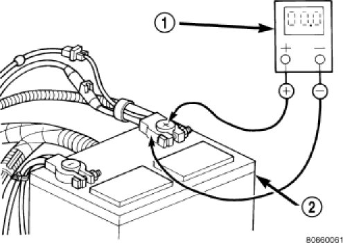 2. Connect the positive lead of the voltmeter (1) to the battery positive terminal post. Connect the negative lead of the voltmeter to the battery positive cable terminal clamp. Rotate and hold the ignition switch in the Start position. Observe the voltmeter. If voltage is detected, correct the poor connection between the battery positive cable terminal clamp and the battery positive terminal post.