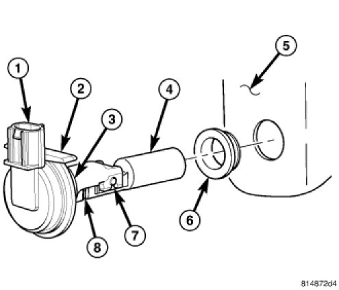 The washer fluid level switch is a single pole, single throw reed-type switch mounted on the left outboard side of the washer reservoir (5), just rearward of the washer pump/motor. Only the molded plastic switch mounting flange (2) and the integral connector receptacle (1) are visible when the switch is installed in the reservoir. A short nipple formation (3) extends from the inner surface of the switch mounting flange, and a barb on the nipple is pressed through a rubber grommet seal (6) installed in the mounting hole of the reservoir.