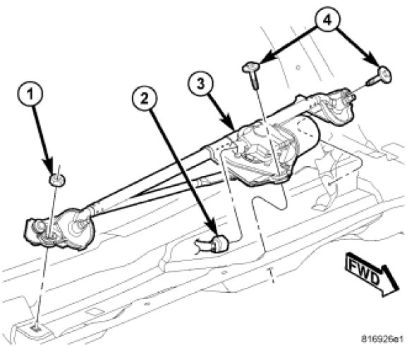1. Position the front wiper module (3) into the cowl plenum as a unit.