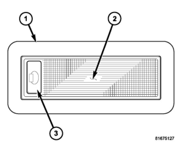 2. Using a small thin-bladed screwdriver, gently pry the switch end of the reading lamp lens (2) away from the lamp housing (1) far enough to unsnap the switch end of the lens from the housing. The switch end of the lens is identified by a tactile concave depression (3).