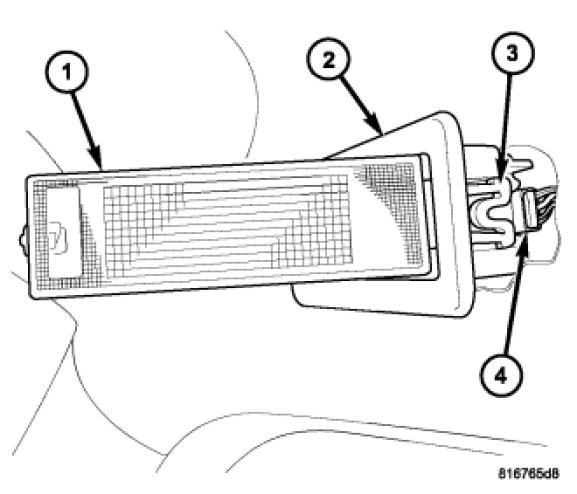 4. Pull the lens hinge/retainer (3) end of the housing outward from the headliner far enough to disconnect the wire harness connector (4) from the back of the lamp.