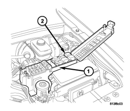 1. Position the front blower motor relay (2) into the proper receptacle of the power distribution center (PDC) (1).