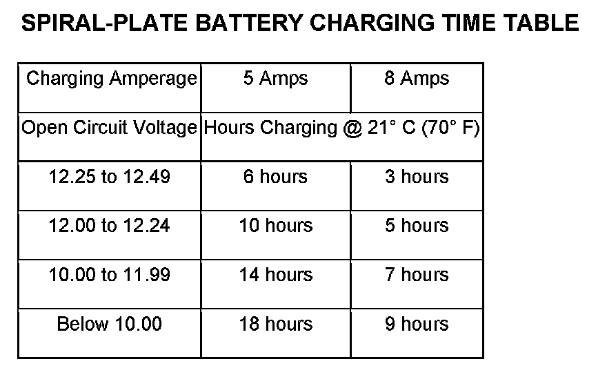 The Battery Charging Time Table gives an indication of the time required to charge a typical battery at room temperature based upon the battery state-of-charge and the charger capacity.