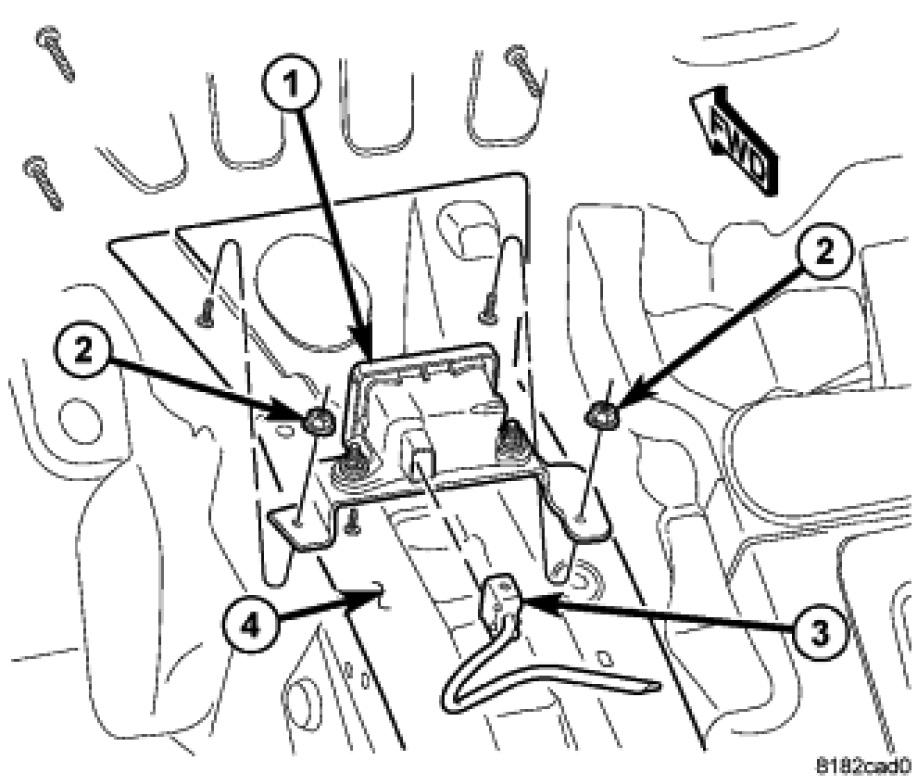 1. Install the dynamics sensor (1) over the studs mounted to the floor pan tunnel (4).