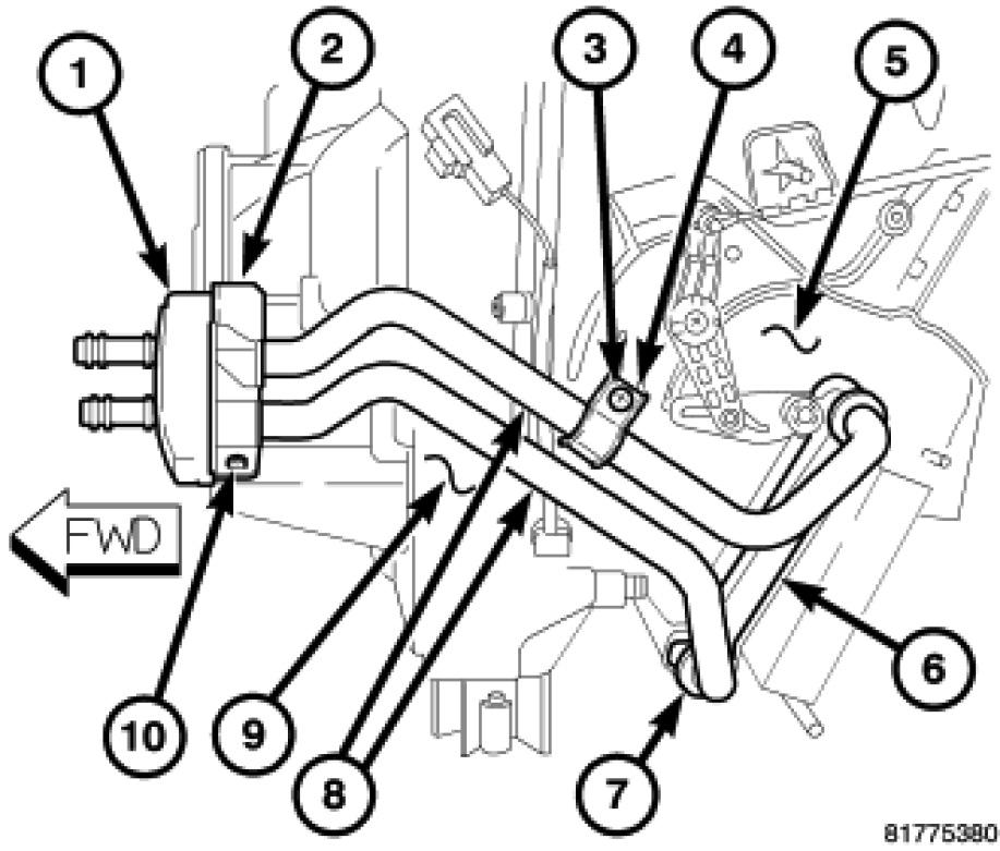 5. Remove the screw (3) that secures the retaining bracket (4) for the heater core tubes (8) to the left side of the air distribution housing (5).