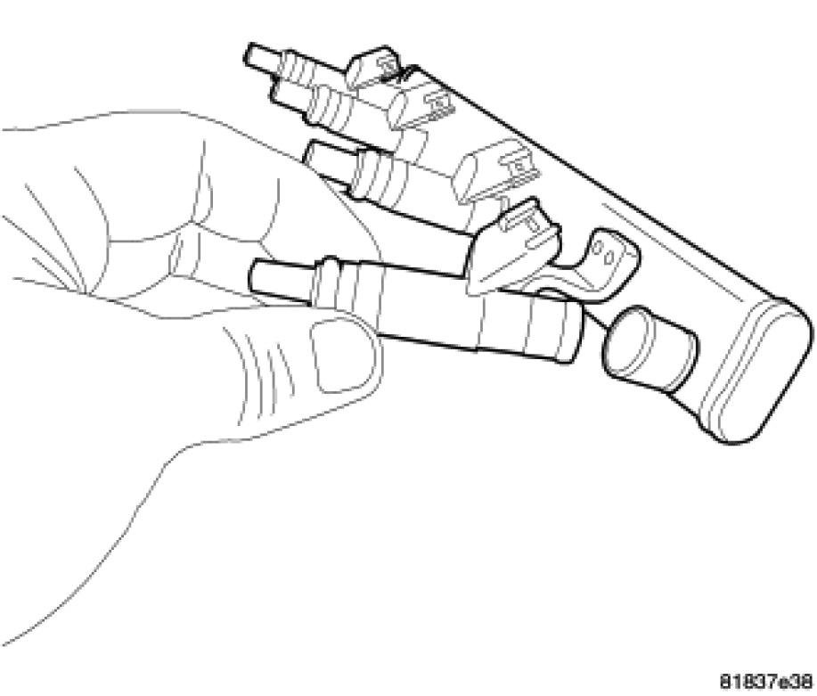 5. Insert fuel injector nozzles into openings in lower intake manifold. Seat the injectors in place.