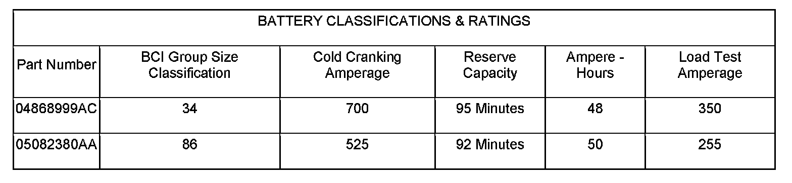 NOTE: Vehicles equipped with a diesel engine utilize a unique battery. The specifications for this battery may differ from the standards shown here. Refer to the battery manufacturer for detailed specifications.