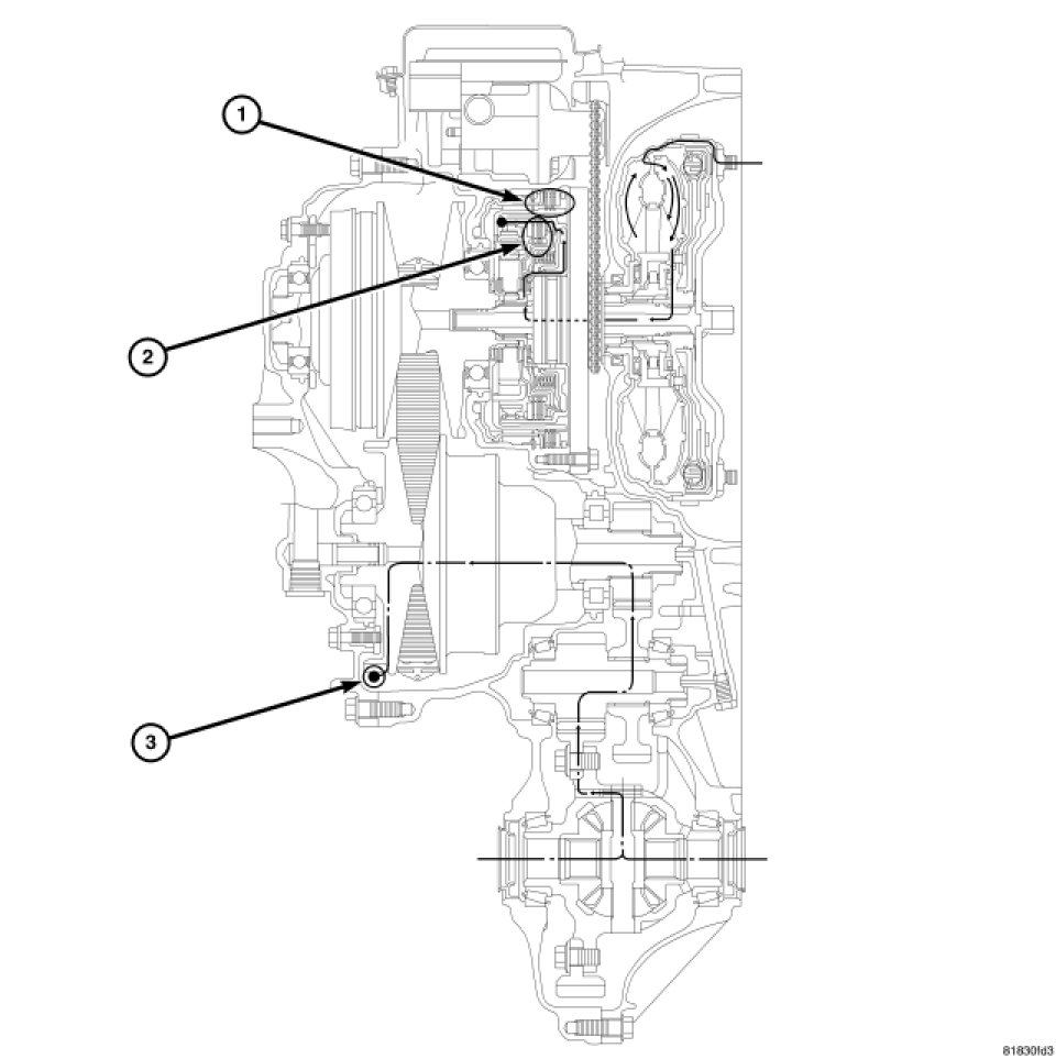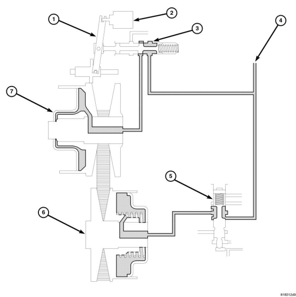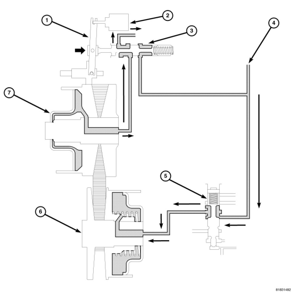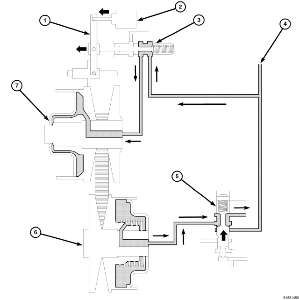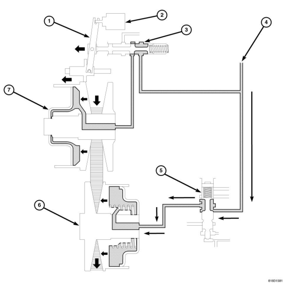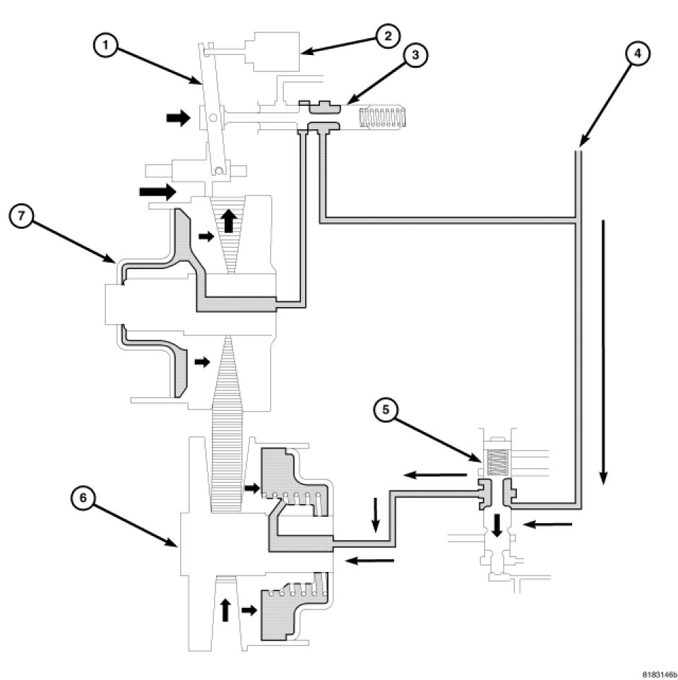 The pulley ratio linkage moves to the right direction in the stepper motor. As the ratio control valve which links to the pulley ratio linkage, moves fluid and the primary pulley is drained.