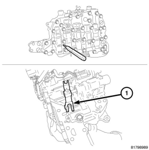 a. Insert a 75 mm (3 in.) long 3 mm (0.118 in.) wide rod or wire into the linkage stopper hole of the valve body assembly to fix the pulley ratio linkage (1).