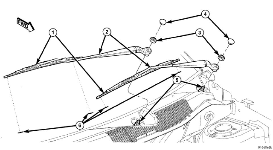 1. The front wiper arms (2) must be indexed to the pivot shafts (5) with the front wiper motor in the park position to be properly installed. Position the wiper arm pivot end onto the wiper pivot shaft so that the wiper blade (1) is aligned with the wiper alignment lines (6), which are horizontal marks concealed in the upper margin of the lower windshield blackout area.