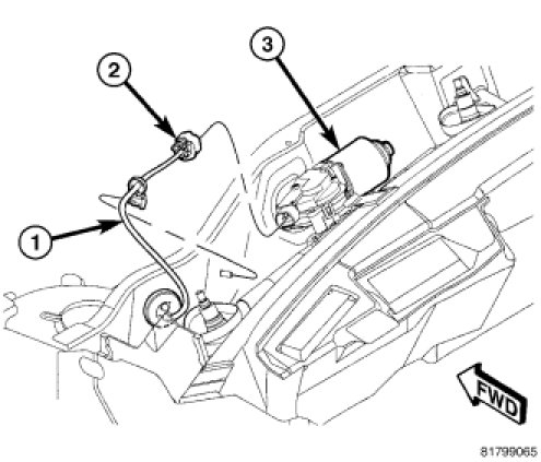 4. Disengage the routing clip from the stud in the cowl plenum and disconnect the wire harness (1) connector (2) from the connector receptacle for the front wiper motor (3).