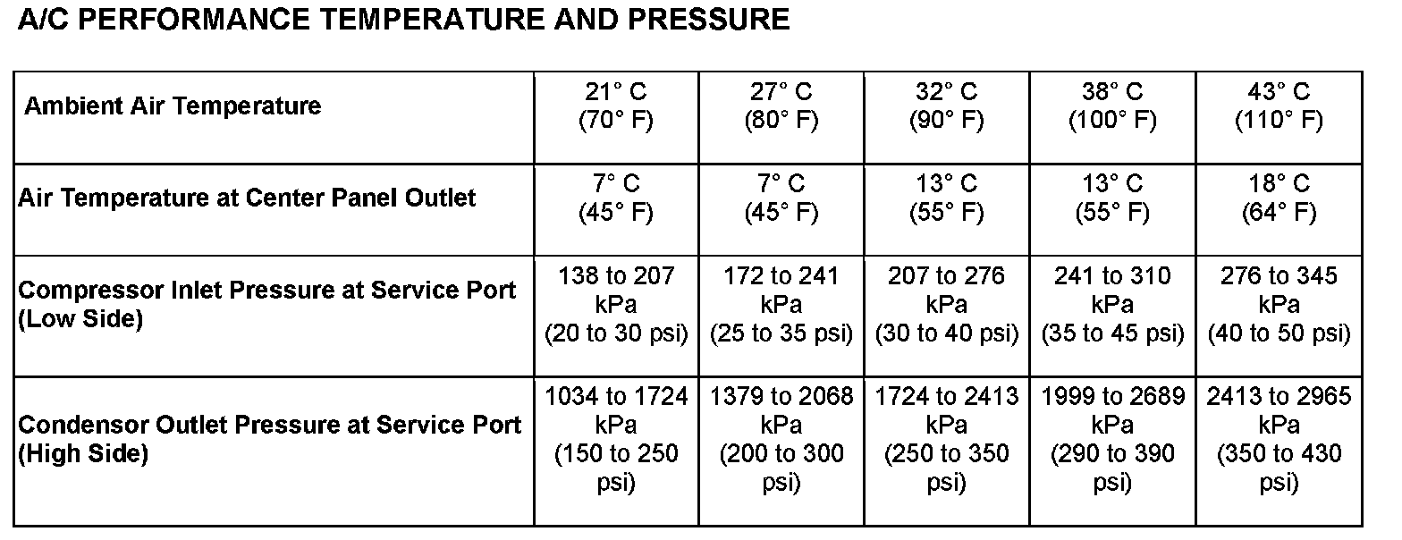 5. With the A/C compressor clutch engaged, compare the air temperature at the center panel outlet and the A/C compressor discharge pressure (high side) to the A/C Performance Temperature and Pressure chart. The compressor clutch may cycle, depending upon the ambient temperature and humidity. If the clutch cycles, use the readings obtained before the clutch disengaged.
