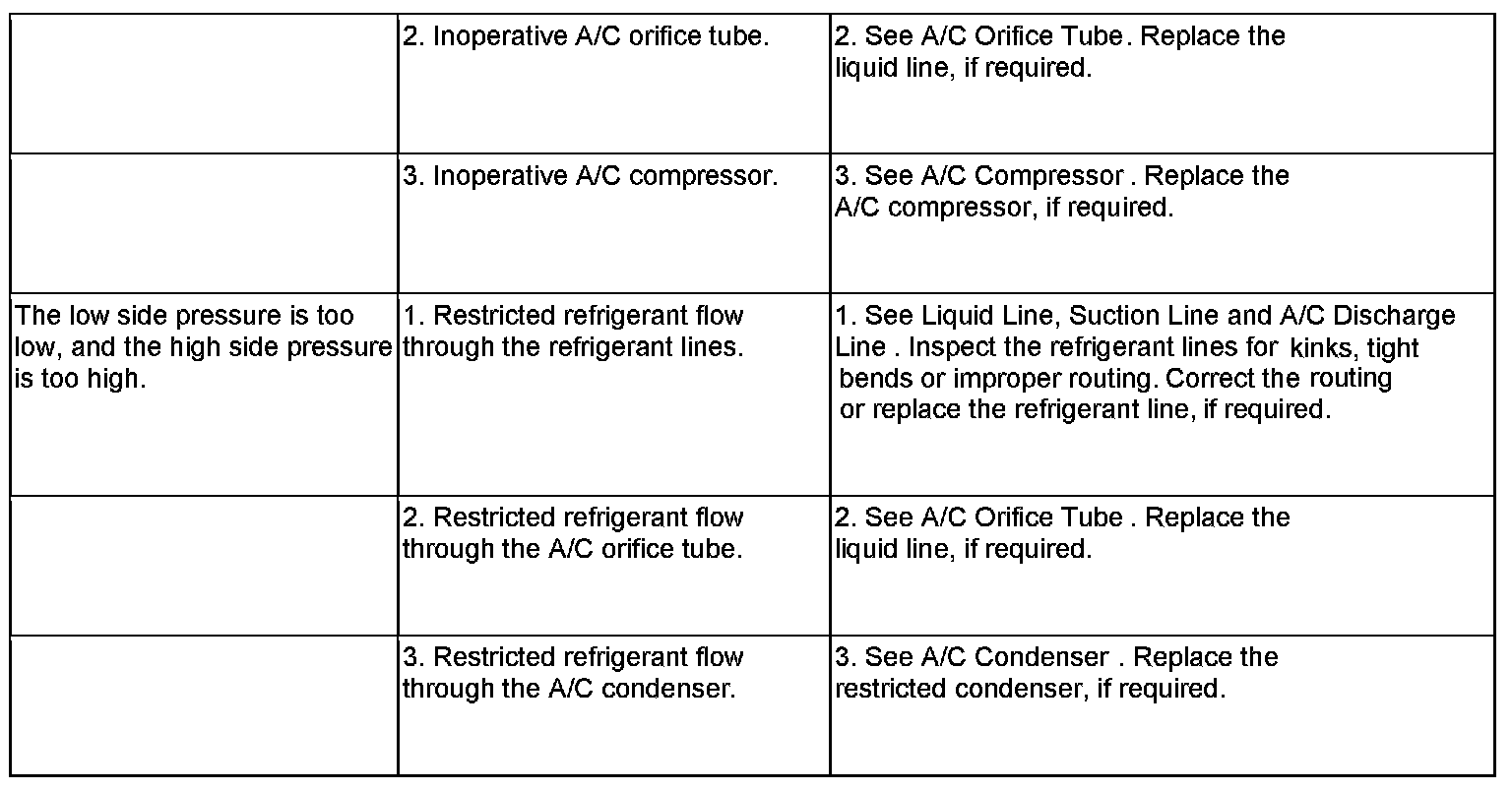 6. If the air outlet temperature fails to meet the specifications in the A/C Performance Temperature and Pressure chart, or if the A/C compressor discharge pressure is high, refer to the A/C System Diagnosis chart.