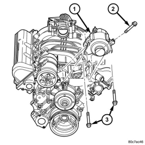 7. 3.7L Engine: Remove 1 vertical generator mounting bolt (2) and two horizontal mounting bolts (3).