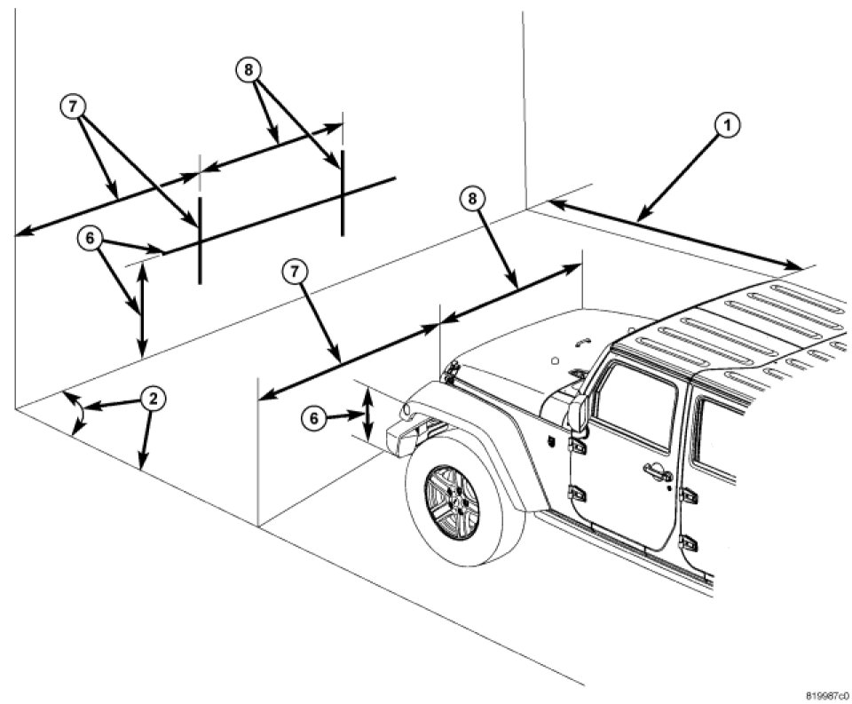 2. An adjacent wall or floor member that is perpendicular to the alignment screen can be used as the vertical zero reference. If there is no adjacent wall or floor member that is perpendicular to the screen, tape a second line on the floor perpendicular to both the alignment screen and the first line, and outboard of either side of where the vehicle will be positioned. This will be used as the vertical zero reference.
