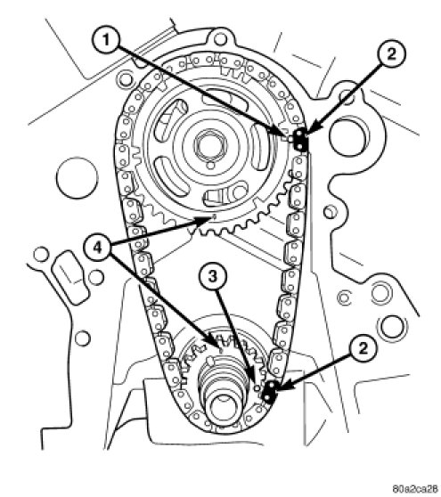 3. Place timing chain around crankshaft sprocket with the plated link (2) lined up with the dot on the sprocket. Install camshaft sprocket into position.