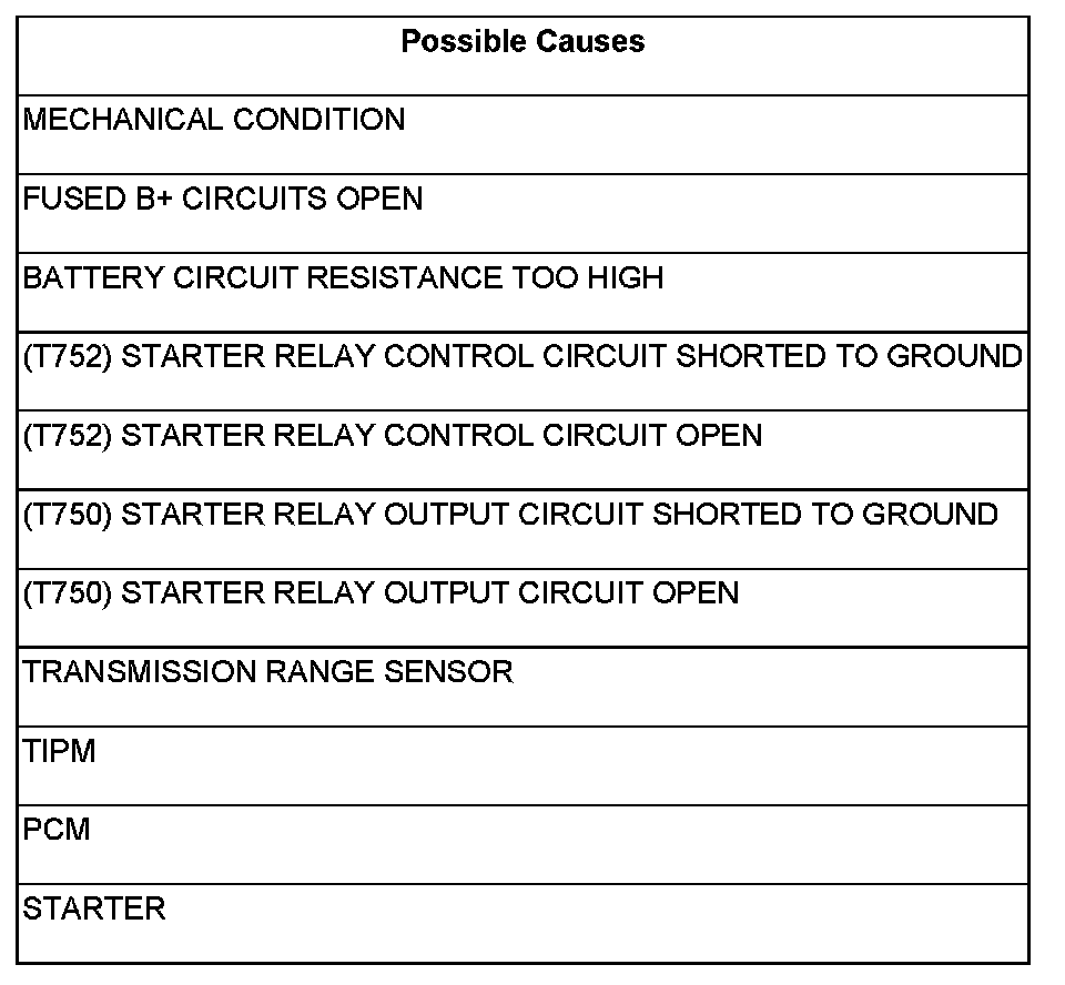 - Repair the excessive resistance or short to ground in the (T752) Starter Relay Control circuit between the PCM and TIPM.