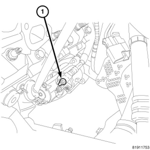 4. Connect the battery cable to the B+ terminal of the starter motor (1). Tighten the cable nut to 13 Nm (115 in. lbs.).