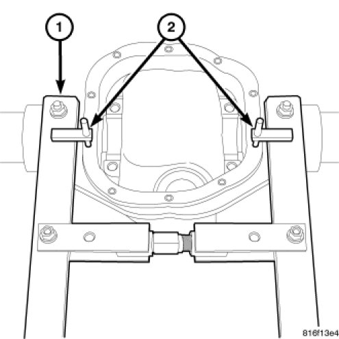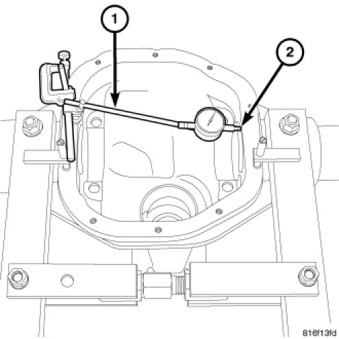 3. Install Pin C-3288-B at the left side of the differential housing. Attach Dial Indicator C-3339A (1) to pin. Load the indicator plunger (2) against the opposite side of the housing and zero the indicator.