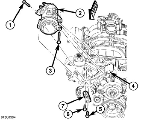 7. Remove A/C compressor (2) and secure away from engine.