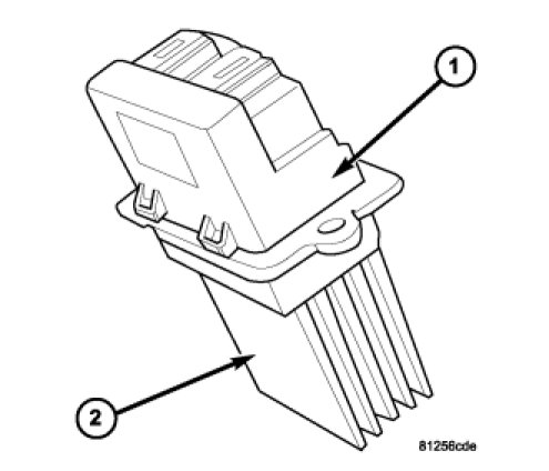 The blower motor power module is mounted to the rear of the HVAC housing, directly behind the glove box. The blower motor power module consists of a molded plastic mounting plate with two integral connector receptacles (1). Concealed behind the mounting plate is the power module electronic circuitry and a large finned heat sink (2).