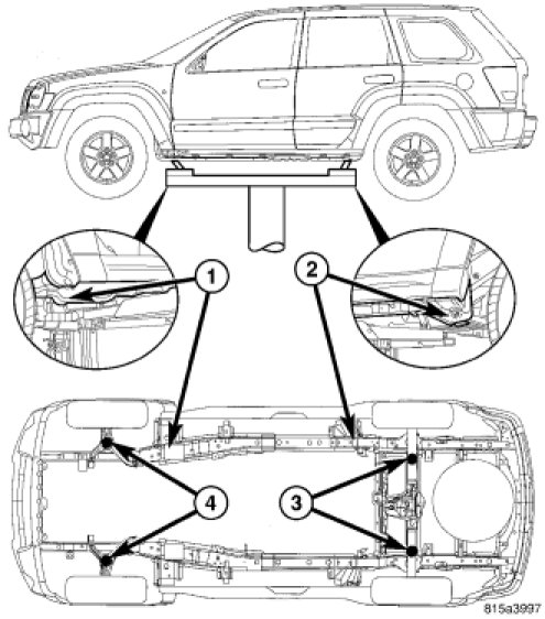 When properly positioned, a floor jack can be used to lift the vehicle (3 and 4). Support the vehicle in the raised position with jack stands at the front and rear ends of the frame rails (1 and 2).