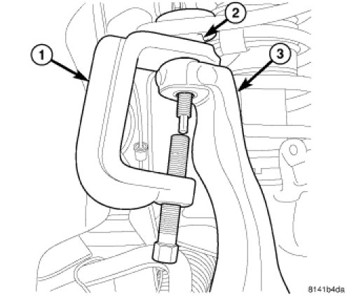 5. Seperate the upper ball joint (2) from the knuckle (3) using special tool #8677 (1).