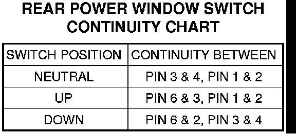 4. Test the power window switch continuity. See the Power Window Switch Continuity chart to determine if the continuity is correct in the Neutral, Up and Down switch positions. If OK, refer to Power Window testingComponent Tests and General Diagnostics. If not OK, replace the inoperative switch.