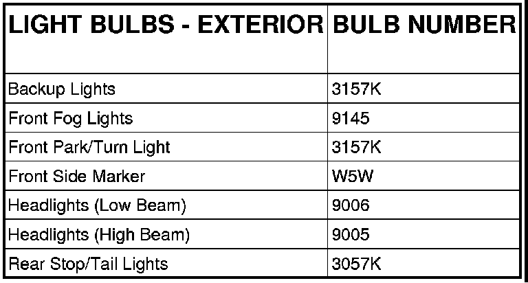 NOTE: Numbers refer to commercial bulb types that can be purchased from your authorized dealer.
