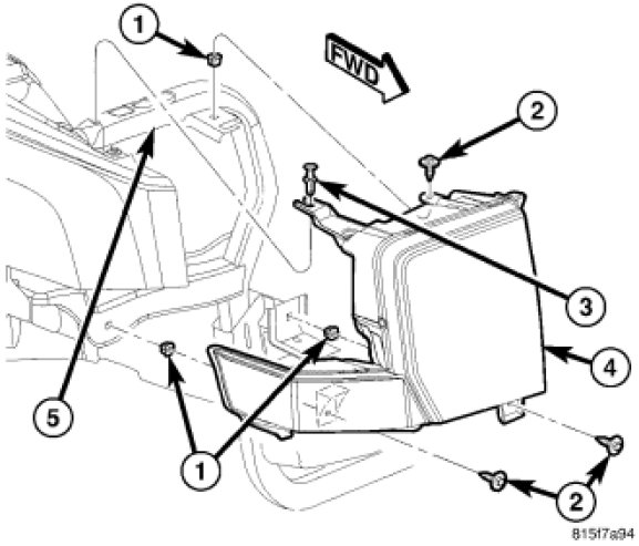 4. Install the push pin fastener (3) that secures the upper outboard lamp mounting bracket to the top of the radiator yoke hydroform.