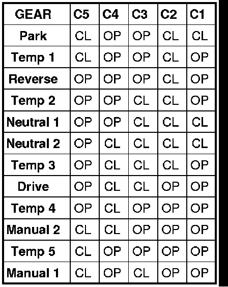 There are many possible combinations of open and closed switches (codes). Seven of these possible codes are related to gear position and five are recognized as "between gear" codes. This results in many codes which should never occur. These are called "invalid" codes. An invalid code will result in a DTC, and the TCM will then determine the shift lever position based on pressure switch data. This allows reasonably normal transmission operation with a TRS failure.