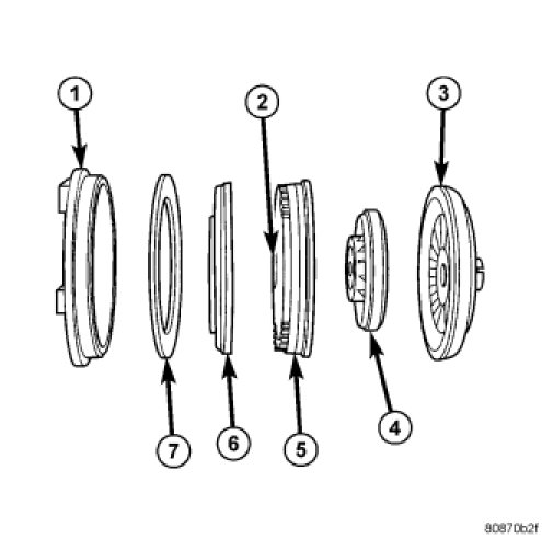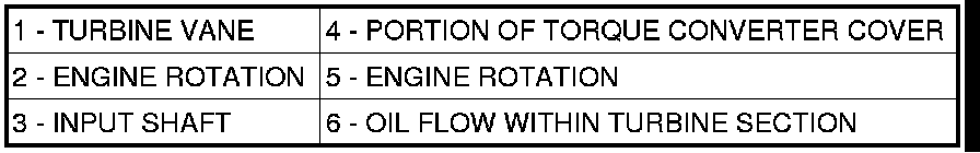The torque converter is a hydraulic device that couples the engine crankshaft to the transmission. The torque converter consists of an outer shell with an internal turbine (1), a stator (2), an overrunning clutch, an impeller (5), and an electronically applied converter clutch (6). The converter clutch provides reduced engine speed and greater fuel economy when engaged. Clutch engagement also provides reduced transmission fluid temperatures. The torque converter hub (3) drives the transmission oil (fluid) pump and contains an o-ring seal (4) to better control oil flow.