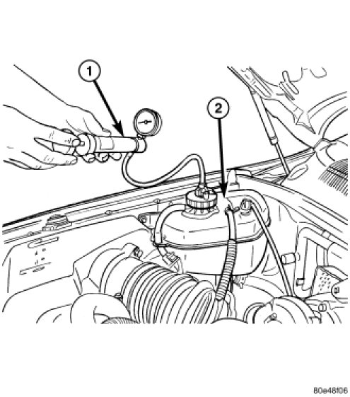 Carefully remove radiator pressure cap from filler neck and check coolant level. Push down on cap to disengage it from stop tabs. Wipe inside of filler neck and examine lower inside sealing seat for nicks, cracks, paint, dirt and solder residue. Inspect radiator-to- reserve/overflow tank hose for internal obstructions. Insert a wire through the hose to be sure it is not obstructed.