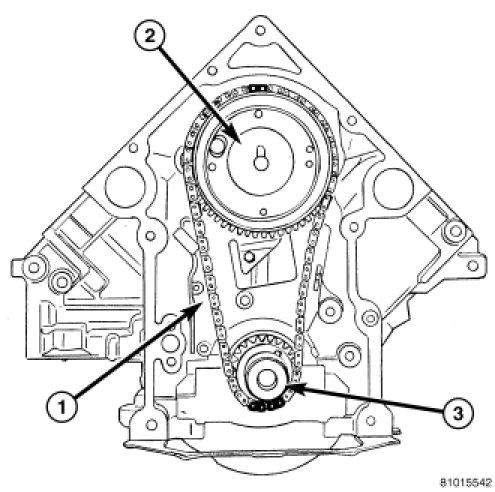 CAUTION: The camshaft pin and the slot in the cam sprocket must be clocked at 12:00 (2). The crankshaft keyway must be clocked at 2:00 (3). The crankshaft sprocket must be installed so that the dots and or paint marking is at 6:00.