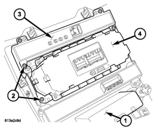 2. Install the screws (2) that secure the A/C-heater control and the EVIC control to the center bezel. Tighten the screws to 2 Nm (17 in. lbs.).