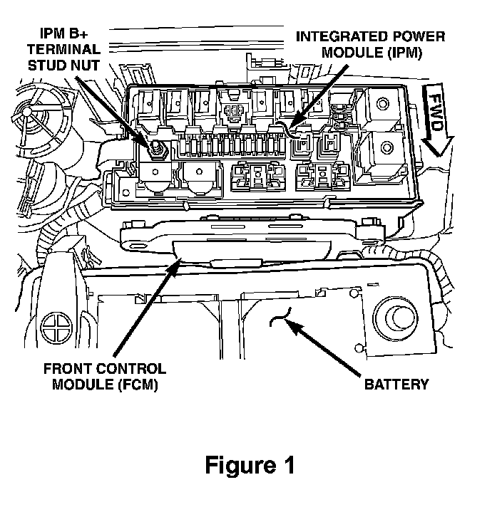 Front Control Module (FCM) damage may occur if the module case comes in contact with the battery while the battery cables are still connected. Always disconnect the battery negative cable prior to removal of the FCM.