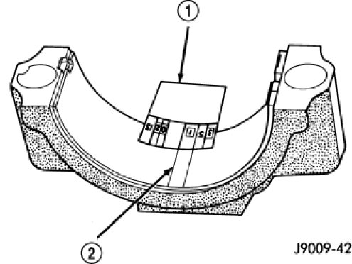 7. If the correct clearance is indicated, replacement of the bearing inserts is not necessary. Remove the Plastigage (2) from crankshaft journal and bearing insert. Proceed with installation.