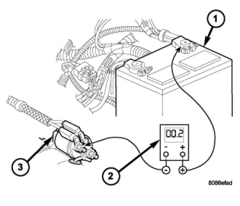 3. Connect the voltmeter (2) to measure between the battery positive cable terminal clamp (1) and the starter solenoid (3) B(+) terminal stud. Rotate and hold the ignition switch in the Start position. Observe the voltmeter. If the reading is above 0.2 volt, clean and tighten the battery positive cable eyelet terminal connection at the starter solenoid B(+) terminal stud. Repeat the test. If the reading is still above 0.2 volt, replace the faulty battery positive cable.