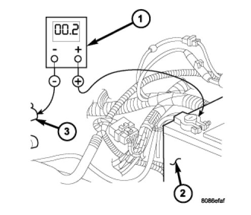 4. Connect the voltmeter (1) to measure between the battery (2) negative cable terminal clamp and a good clean ground (3) on the engine block. Rotate and hold the ignition switch in the Start position. Observe the voltmeter. If the reading is above 0.2 volt, clean and tighten the battery negative cable eyelet terminal connection to the engine block. Repeat the test. If the reading is still above 0.2 volt, replace the faulty battery negative cable.