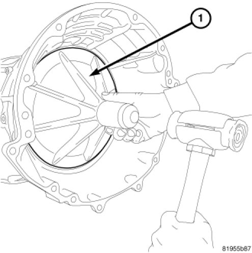 2. Using the front cover installation tool 9955 (1) and a dead-blow mallet, install the front cover into transmission case.
