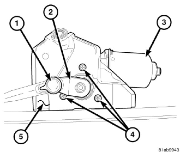 CAUTION: Do not remove the crank arm nut from the wiper motor output shaft. The crank arm is indexed to the output shaft with the motor in the park position during the manufacturing process, but there are no provisions made for correctly indexing this connection in the field. If the crank arm to output shaft indexing is incorrect, the entire front wiper motor and crank arm unit MUST be replaced.